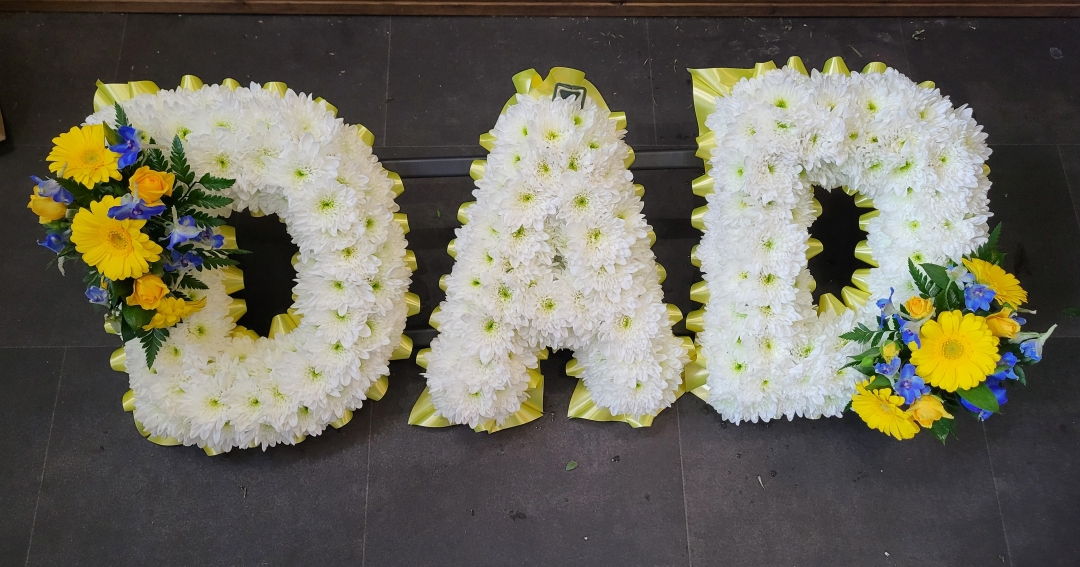 3 Based funeral letters, spelling either Mum, Dad, Nan. Ribbon edging, containing sprays of flowers. Based with white chrysanthemums and including 2 sprays of flowers.