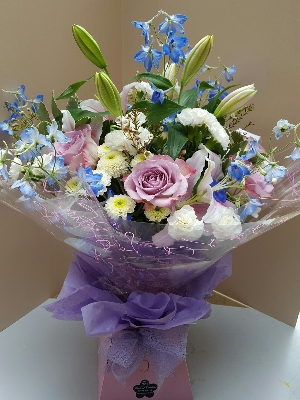 This aqua pack bouquet is made up of Delphiniums, Roses and Lilies as the main flowers with other filler flowers and foliage included to make this beautiful bouquet.