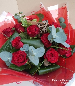 A dozen red premium roses, hand tied, with a mix of foliage.