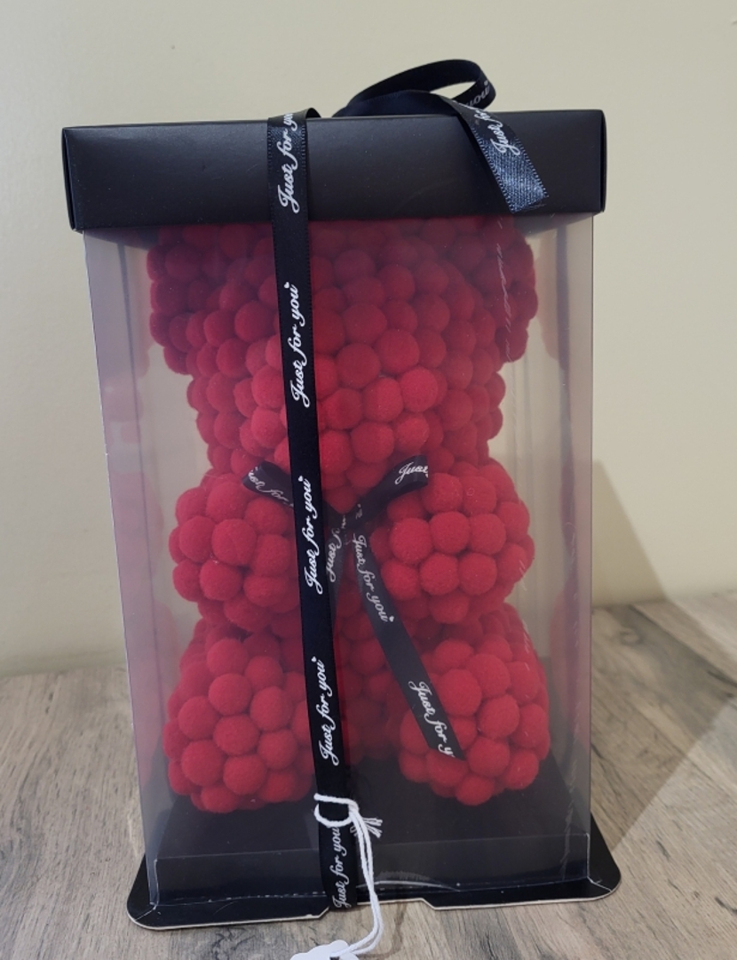 Cute Pom Pom Teddy boxed, great gift to keep. Boxed size 25cm. Ribbon with "just for you"