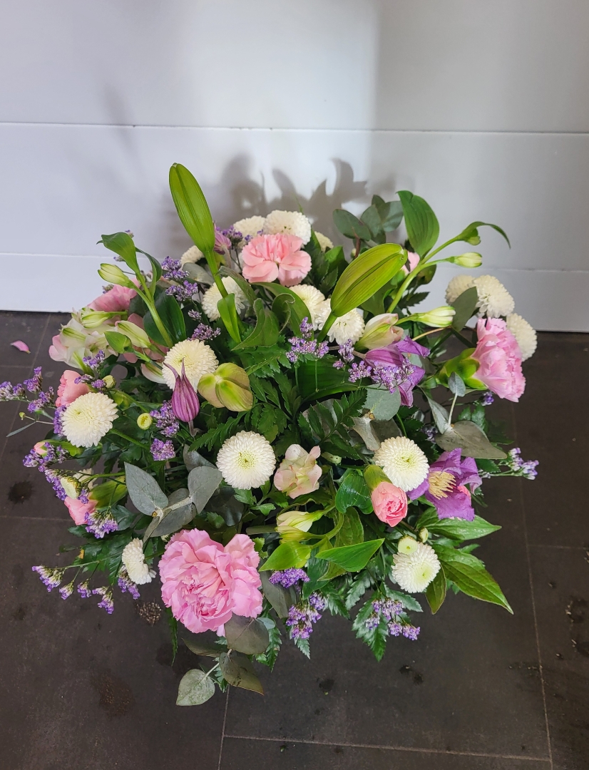 A beautiful arrangement delivered in this pretty birdcage container in oasis containing pink, white purple flowers. The 3rd image is from the top of the design.